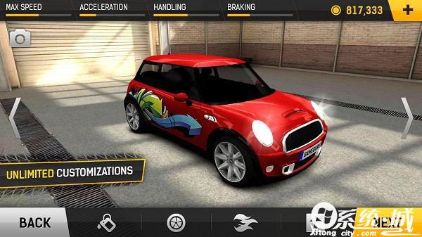 3、玩家可以在这里对自己的赛车进行改装升级,还有一定的装饰品可以装饰,贴上酷炫的标签。
